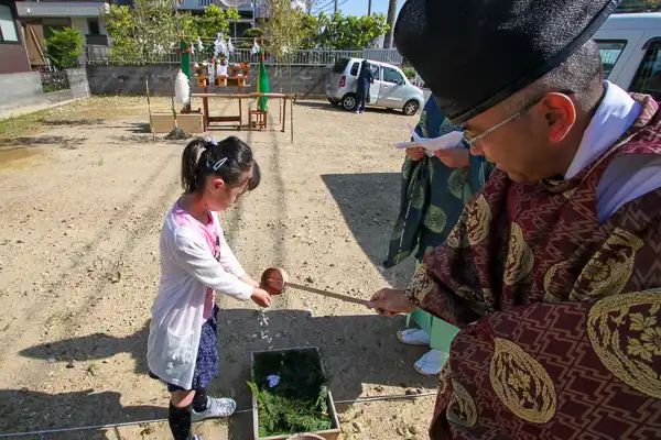 更地になった状態で建物の実寸大の地縄をはり地鎮祭を執りおこないます。お隣との距離だったり配置もこのとき一緒に確認して頂きます。