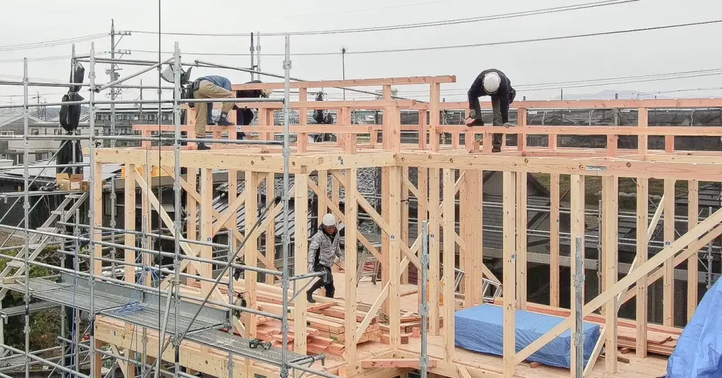 建物の骨組みを組み立てていきます。建て方とか建前、棟上げとか呼び方はいろいろです。