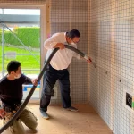 現場で専門業者さんが大きな機材を使って壁の中や天井裏に断熱材を吹き込んでくれます。