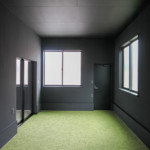床には芝をイメージした緑のタイルカーペットを敷き詰め土間の冷たさを軽減しています。