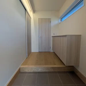 大瀬の家の完成した玄関。ナグリの栗の床板が良い感じ
