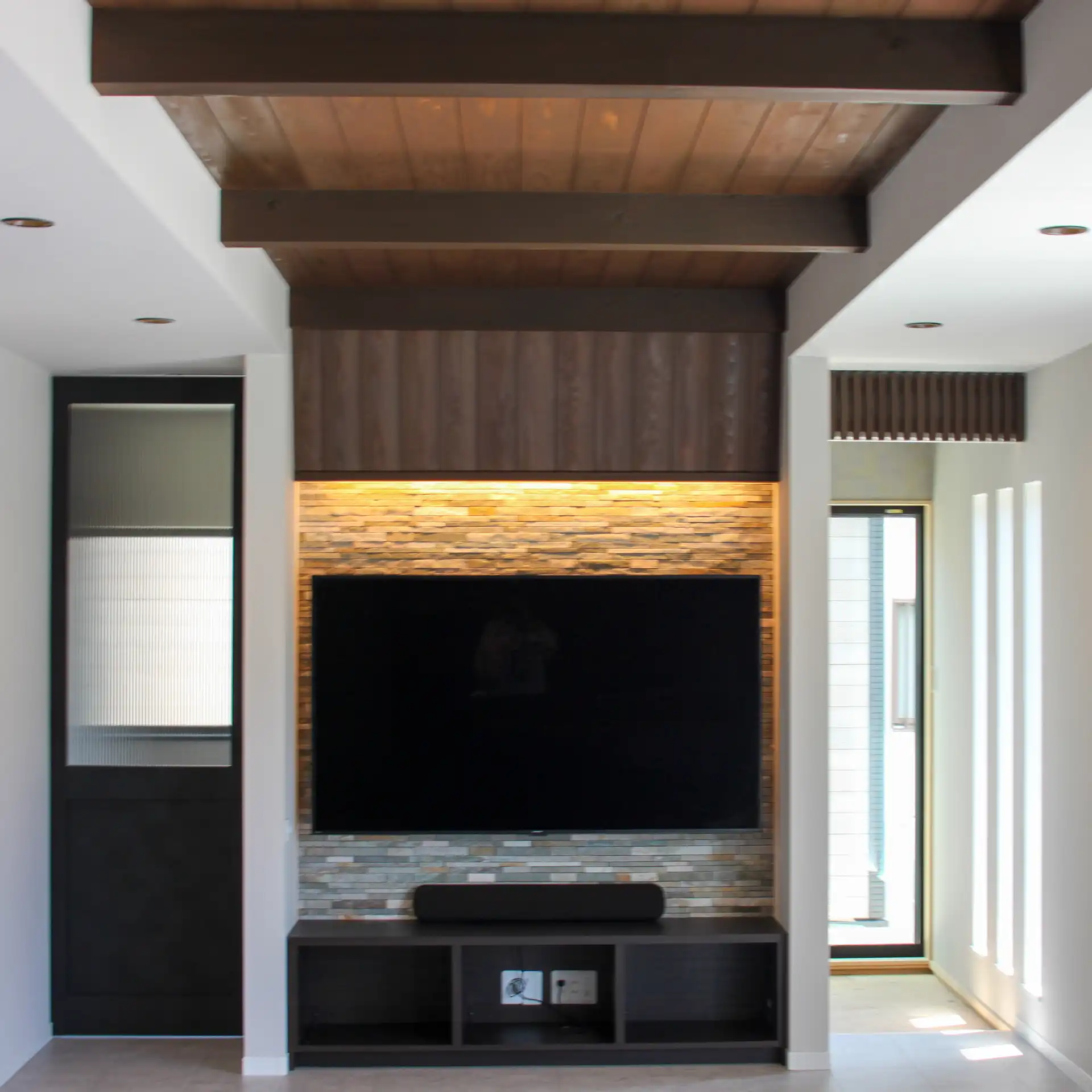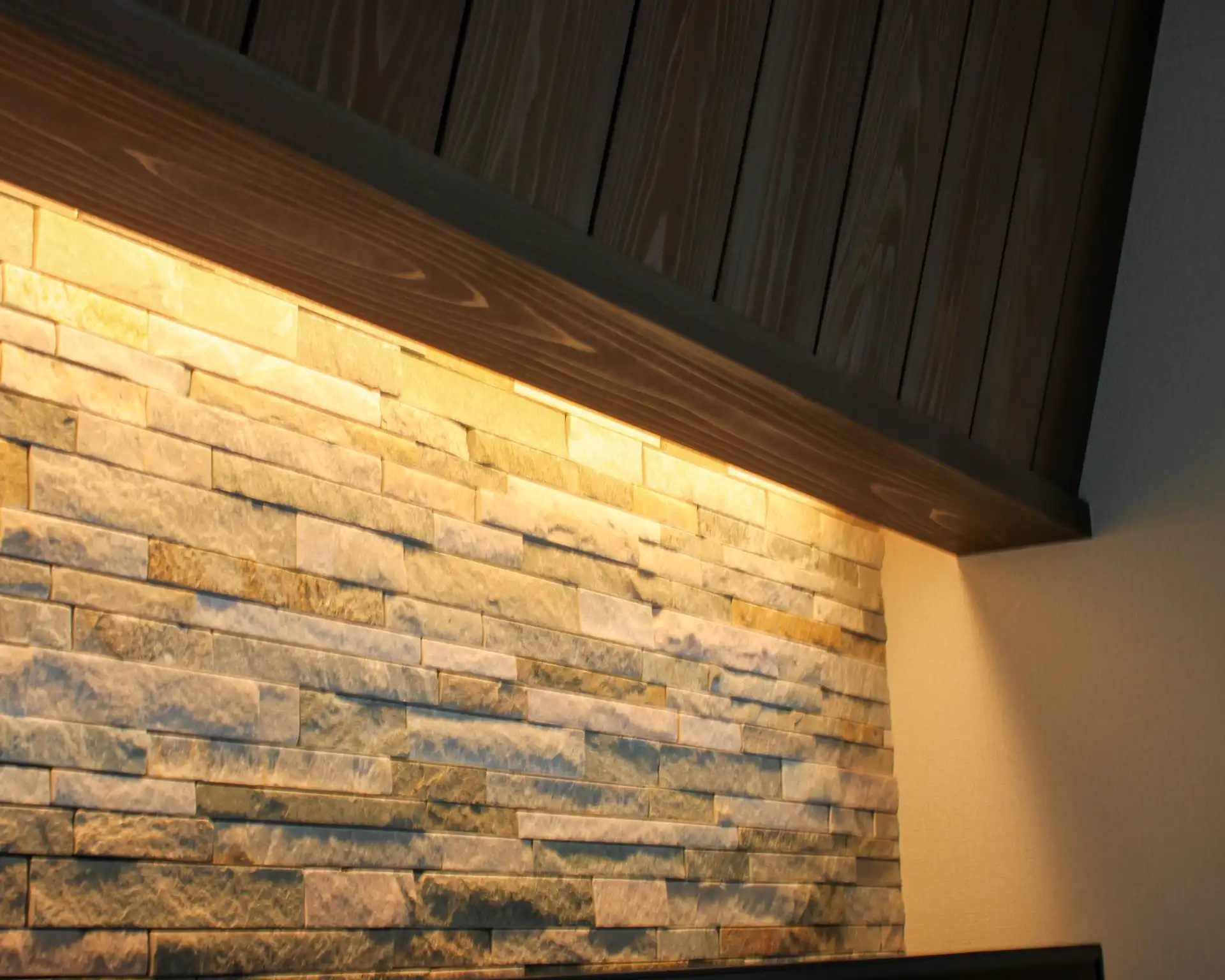 TVボードの幅に合わせて天井を折り上げ、天井材とTVボード周りの垂れ壁を同じ杉板で仕上げることで、壁からTVまわりへと連続感のある、すっきりとしたデザインにまとめました。逆に壁の石材タイルに陰影が浮かぶよう間接照明を仕込み、石材の質感と斜めの垂れ壁が生む立体感を強調し個性を出しました。シンプルな形状に個性的なテクスチャーを組み合わせることで、空間全体にダイナミックな表情を持たせています。